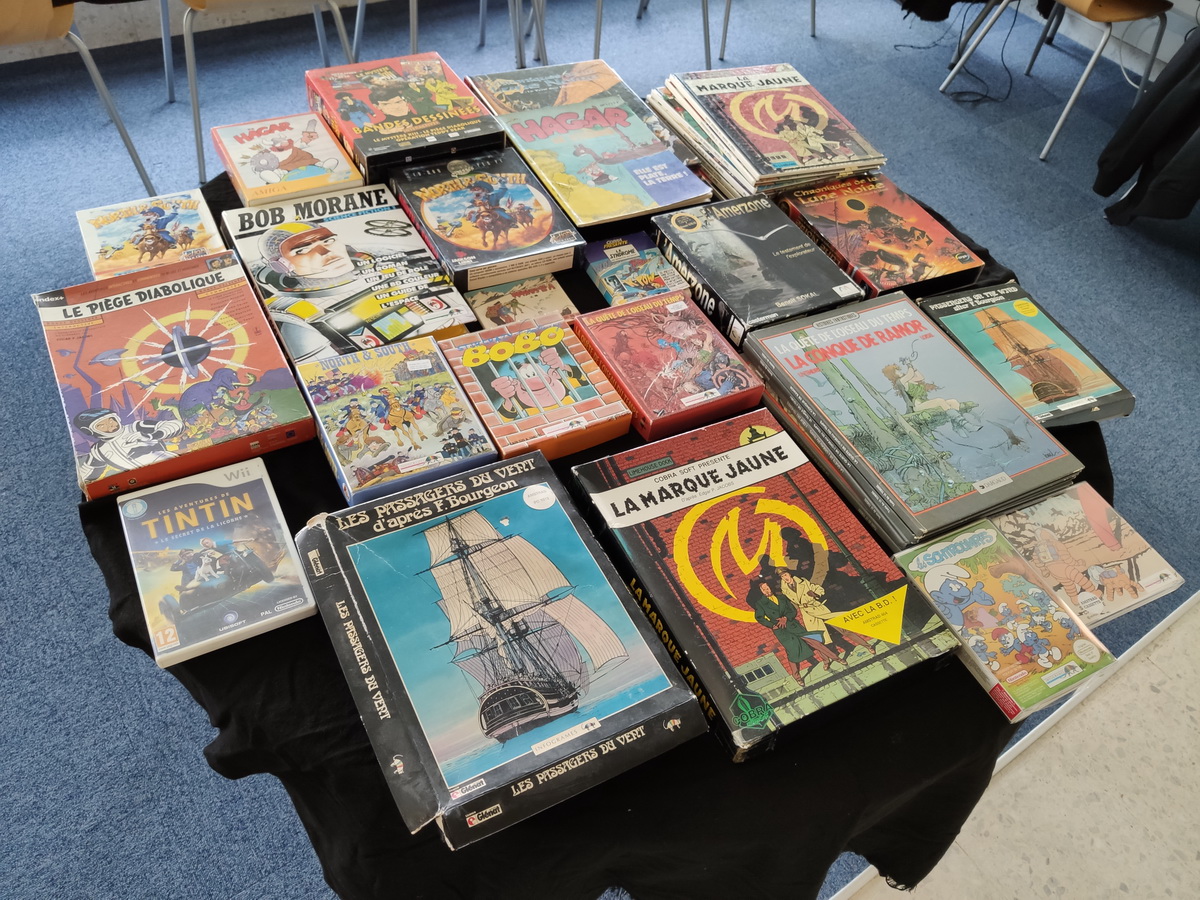Alors que les premiers studios de création de jeux vidéo florissaient dans les années 80 (CobraSoft, UbiSoft), des amitiés existaient déjà entre les fondateurs de ceux-ci et les dessinateurs de BD, qu'ils soient français, belges ou d'ailleurs. C'est donc tout naturellement que de nombreuses bandes dessinées se sont vues être adaptées en jeux vidéo et parfois même sous des formes innovantes pour l'époque. Au-delà des grandes licences connues de tous comme "Les Schtroumpfs", "Astérix" ou "Lucky Luke", il est nécessaire de faire un travail de rétrospective et creuser un peu le sujet pour découvrir certaines adaptations plus adultes comme "Les passagers du vent", "XIII", "Blake & Mortimer" ou "Les chroniques de la lune noire". Au travers d'une douzaine de jeux jouables sur des machines vintages (consoles et ordinateurs), David BAGEL nous présente sa collection de jeux vidéo qui raviront petits et grands !