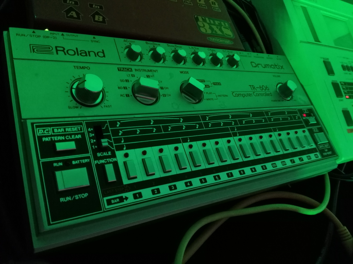 Synthétiseurs analogiques : Roland TR-606 Roland TB-303 Roland MC-202 Yamaha CS01 Synthétiseurs analogiques : Roland Juno6 Yamaha DX7 Ordinateur Yamaha CX5M, Cartouche DX7 Roland TR-707 Roland TR-505 Casio VL-1