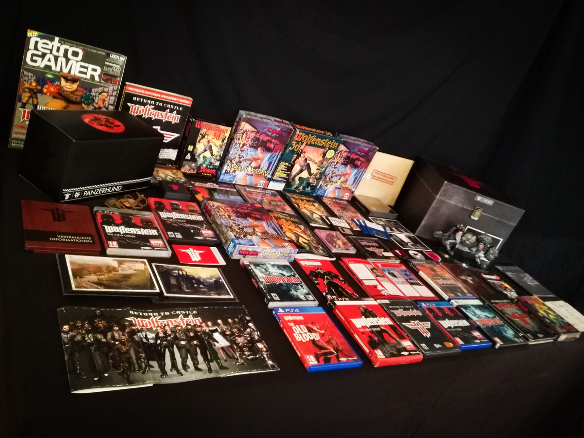 Environs 50 boîtes de jeux (versions USA, EUR, JAP) Goodies, posters, magazines… LAN pour 4 joueurs : 4 laptops HP Wolfenstein jouable sur : Atari Jaguar Super Nintendo Sony PS3 PC 486 DX2-50 Version « spilt-screen » à 2 PC récent pour Wolfenstein The new order, The old blood, Wolfenstein II : The new colossus